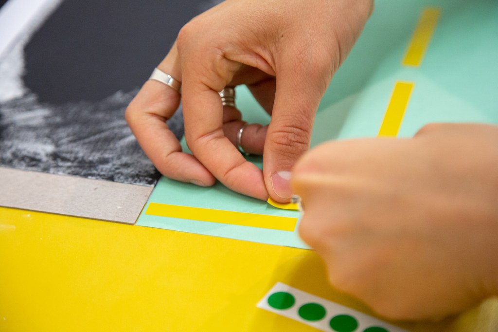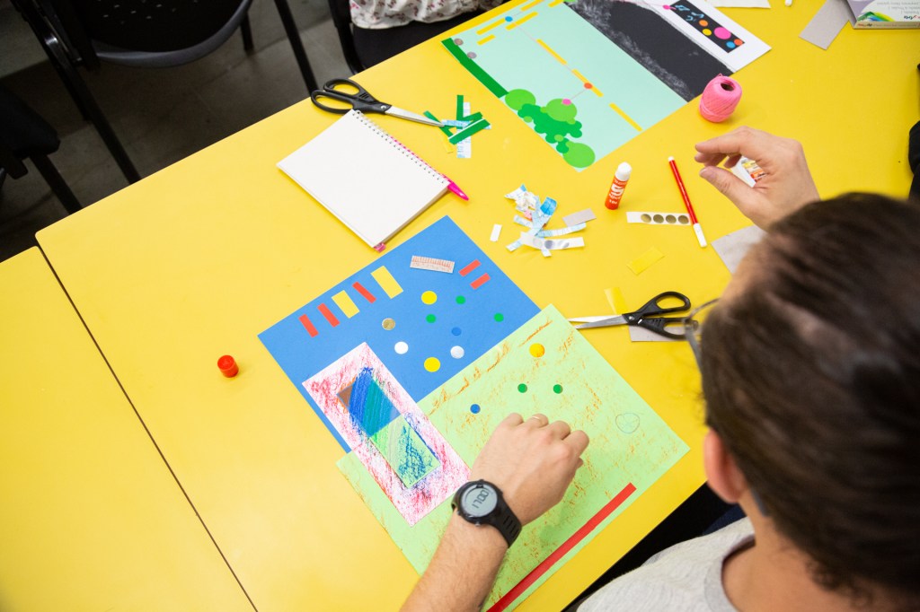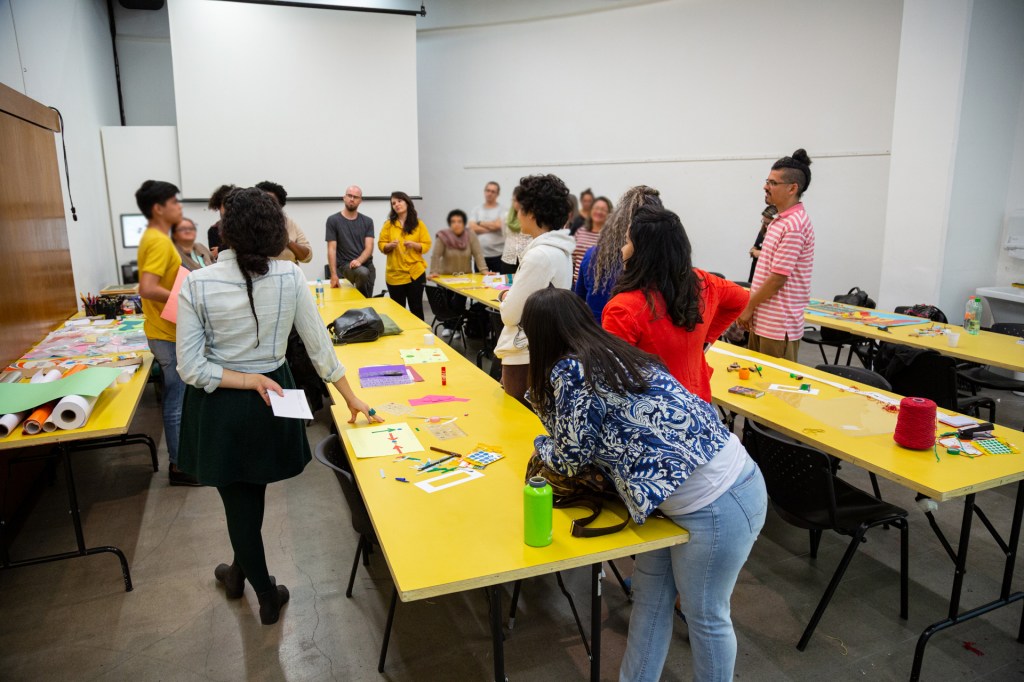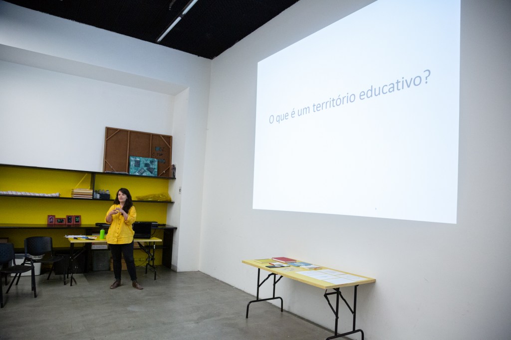 A partir de um debate sobre o que é um território educativo, as e os participantes foram convidades a experimentar, por meio de materialidades, maneiras de tornar visível a relação da escola em que atua com o seu entorno, mapeando os afetos e potencialidades que cada território possui.