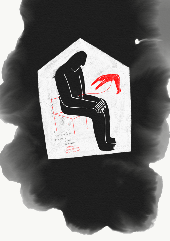 Com o atual confinamento físico instaurado, questões ligadas ao corpo e sua relação com o espaço se intensificaram. Refletindo sobre as diferentes frentes e escalas que essa relação pode ter, às vezes olhamos para dentro: nossos pensamentos, nossos movimentos, nossas manias, nossos desejos, nossas máscaras, nossa tez; e às vezes para fora: a relação com o entorno, as interações e sentimentos perante “x outrx”. A reflexão sobre o corpo não se restringe a nós mesmos.